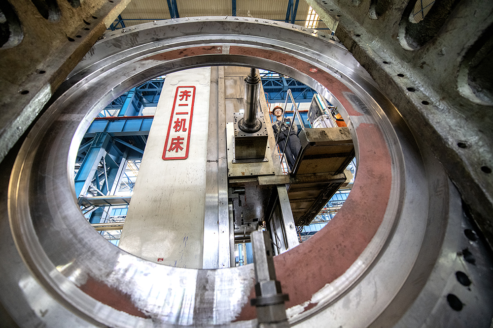 北方重工重大部件分廠員工正在加工旋回破碎機(jī)主軸